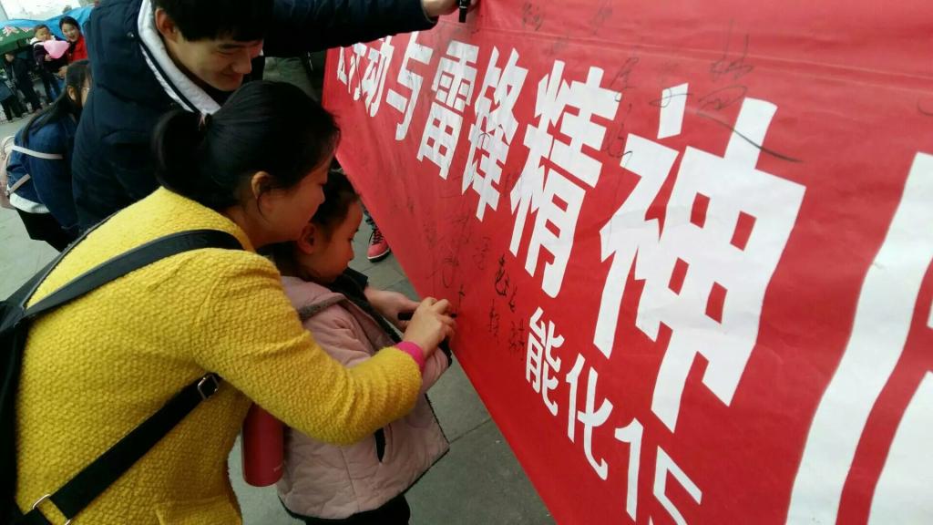志愿者们从龙湖南路出发,一路上与路旁环卫工人进行亲切互动,在帮助他们清扫道路垃圾的同时还向他们询问有关雷锋的感人事迹,并不断地向他们说明卫生安全的重要性,对预防流行性感冒起到重要作用。活动后半程,志愿者们在朝阳中路拉起横幅,向过往的行人宣扬雷锋精神,并引导他们签名。最后,志愿者们将自己制作的爱心礼物送给辛苦的环卫工人,并和他们进行合影留念。
